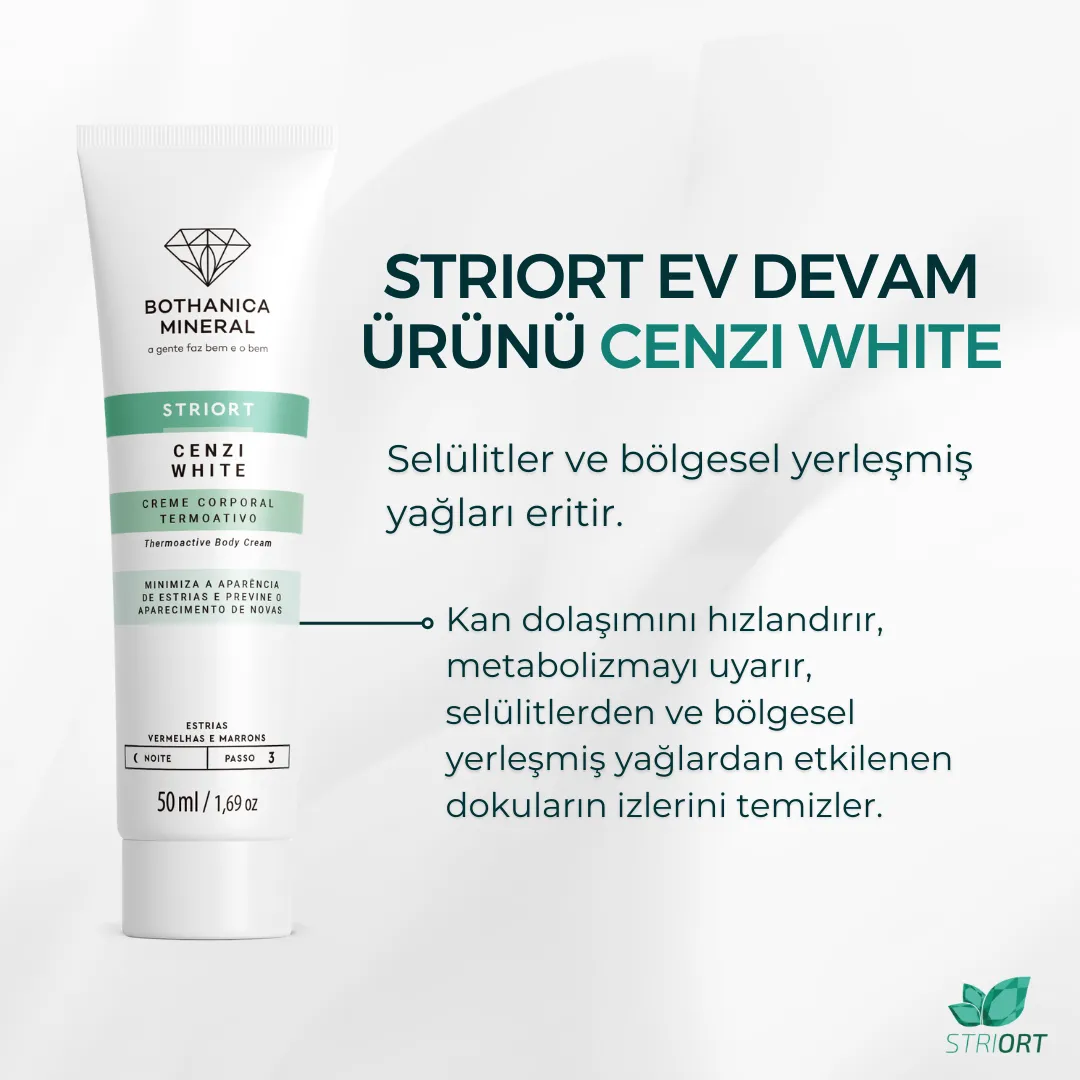 STRIORT seansı sonrası kullanabileceğiniz "Evde Devam" serisinden CENZI WHITE, kan dolaşımını hızlandırır, metabolizmayı uyarır ve selülitler ile bölgesel yerleşmiş yağlardan etkilenen dokuların izlerini temizler.